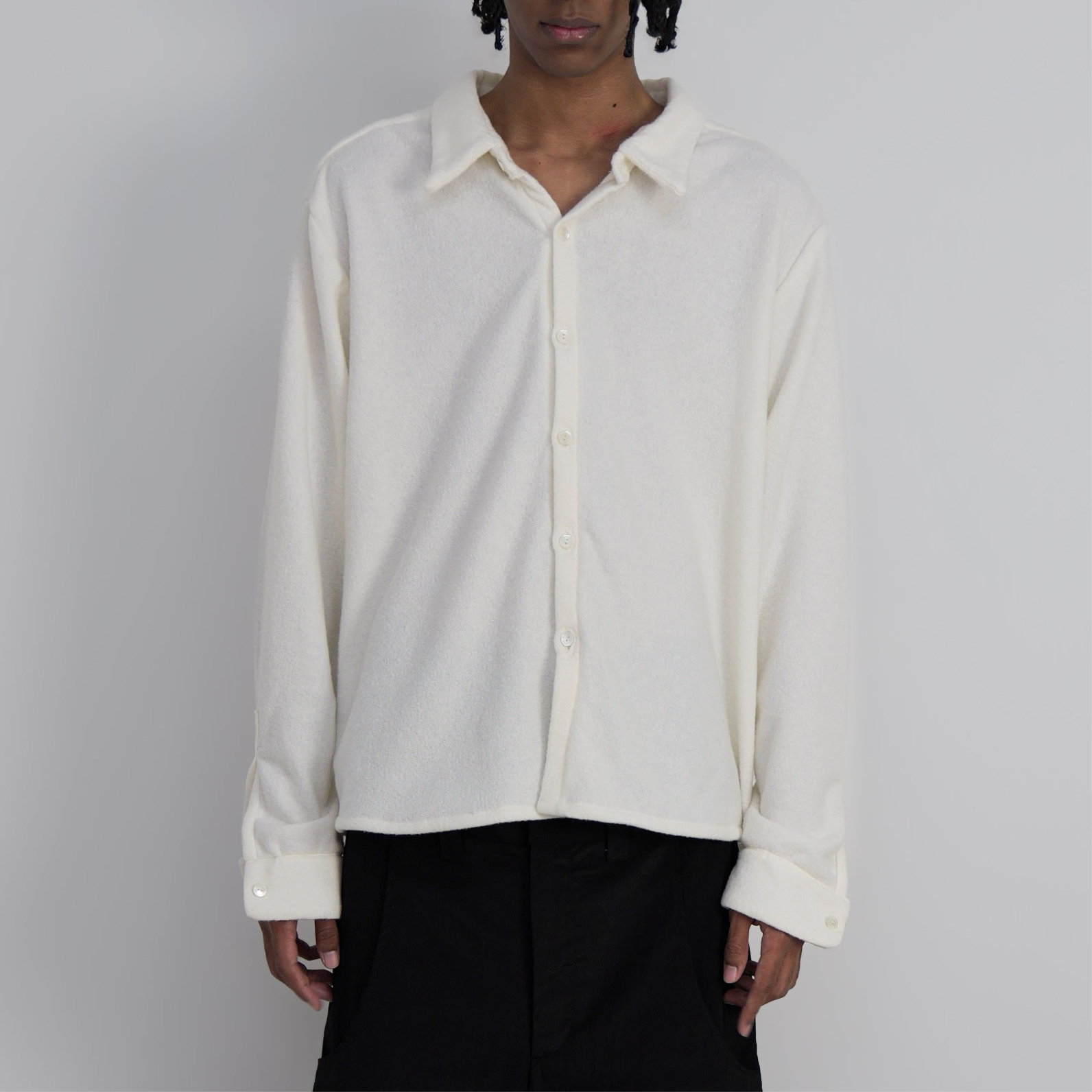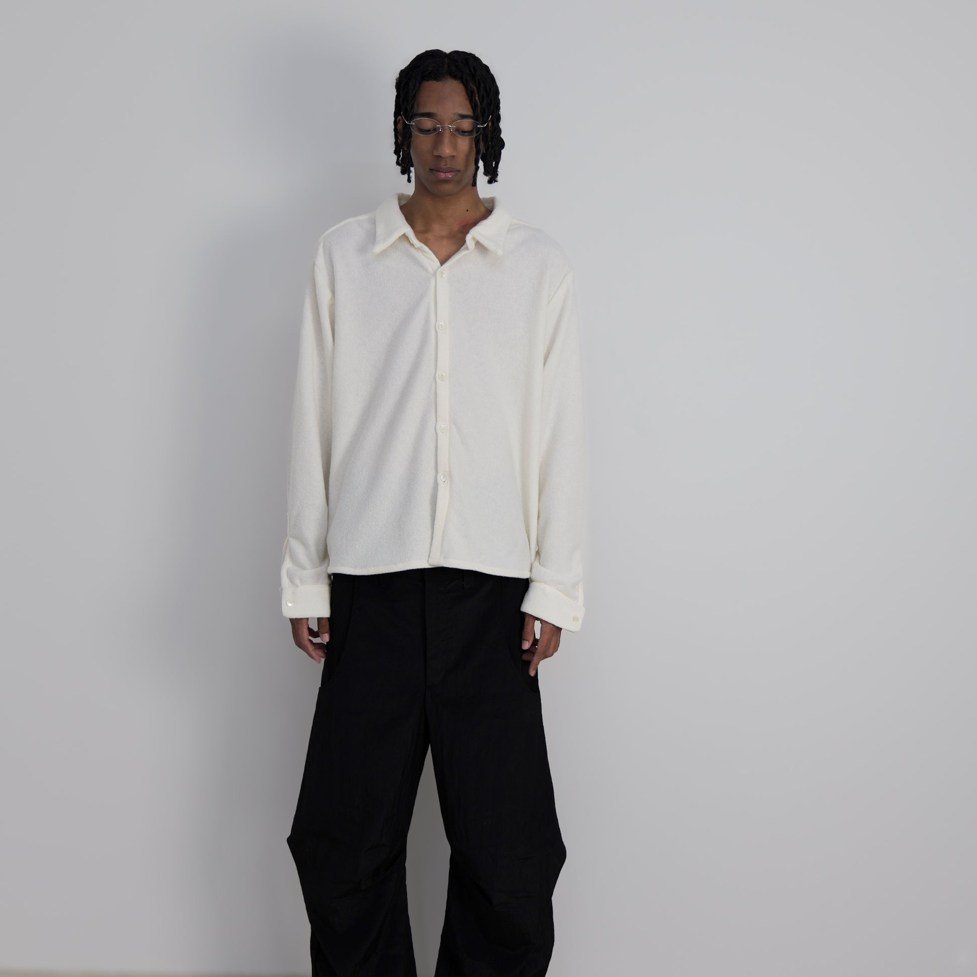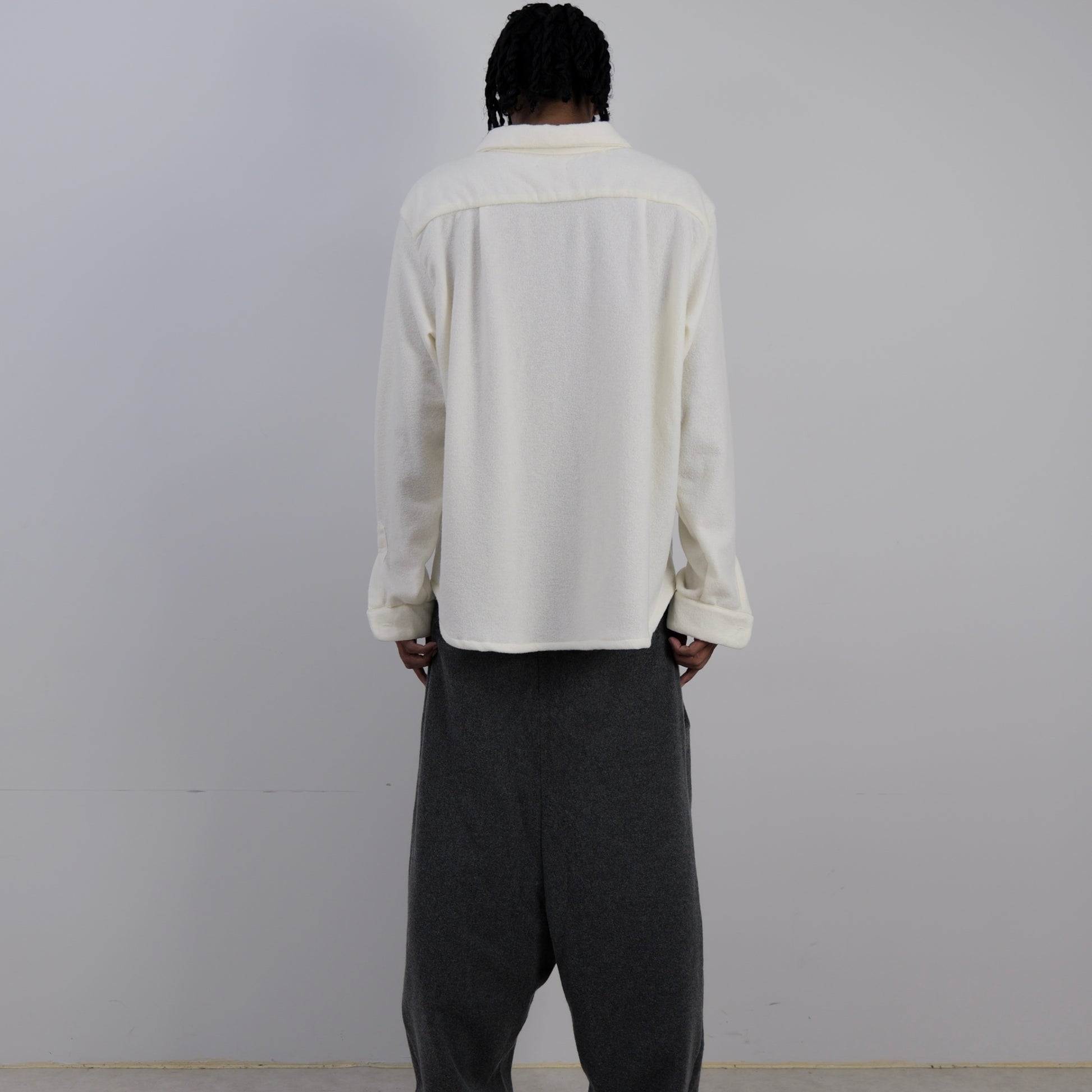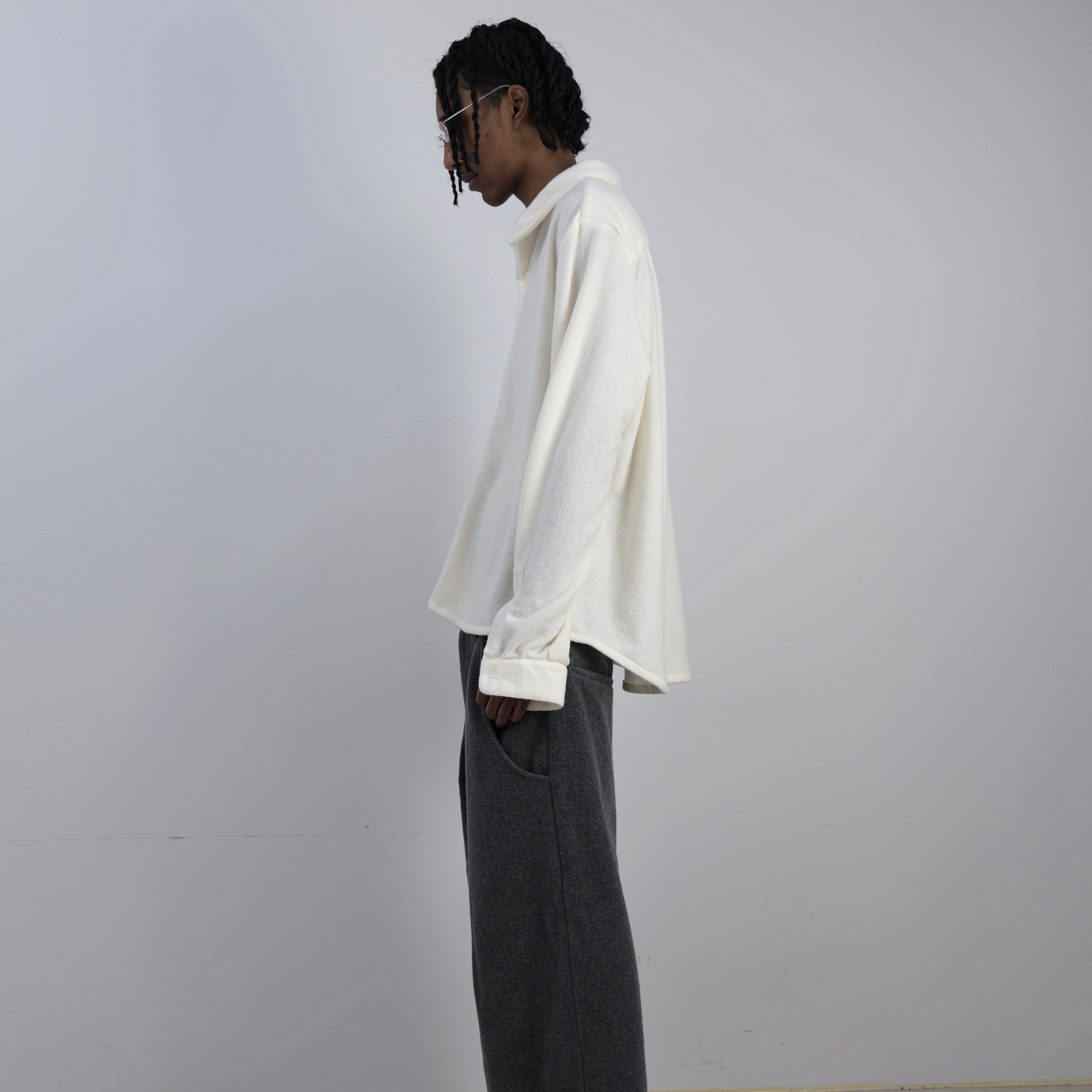 細番手のウールにナイロンを撚糸させた糸により、表情感が生まれた温もりを感じさせる一着。ゆったりとしたシルエットでありながらもアウター、インナーの二面性を持つサイズ感に調整。シェルボタンを使用。