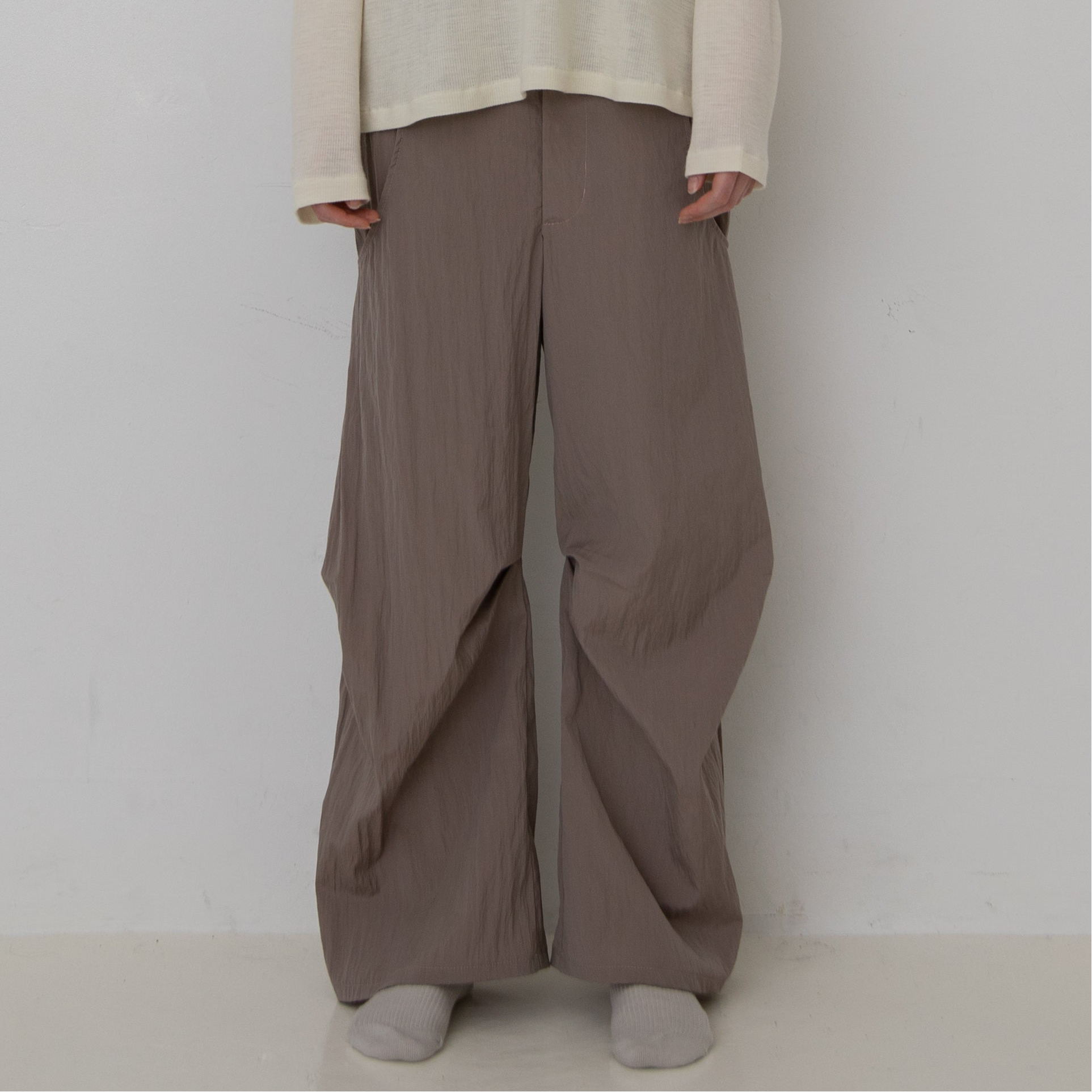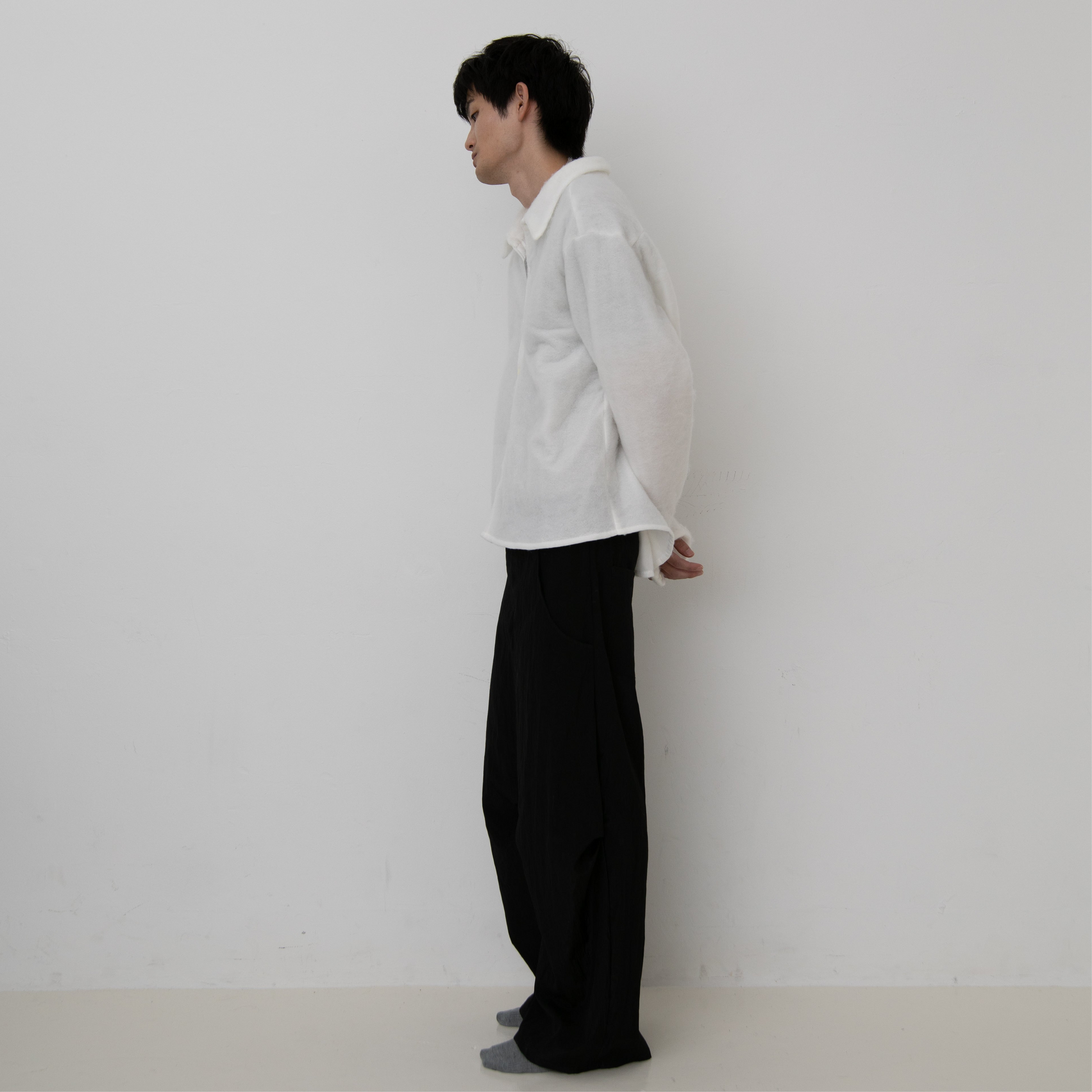 ウール、ナイロンを高密度に織り、ナイロンの収縮を利用したシボ感のある表情が特徴。ストレートパンツに計算されたニータックを加えることで作り出された立体的なシワがアクセントを生み、日常に溶け込む。